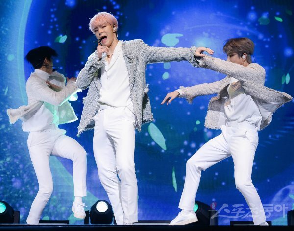 그룹 아스트로(ASTRO) 문빈이 16일 서울 강남구 삼성동 코엑스 아티움에서 열린 첫 정규 앨범 ‘All Light(올라잇)’ 발매 쇼케이스에서 열정적인 무대를 펼치고 있다.