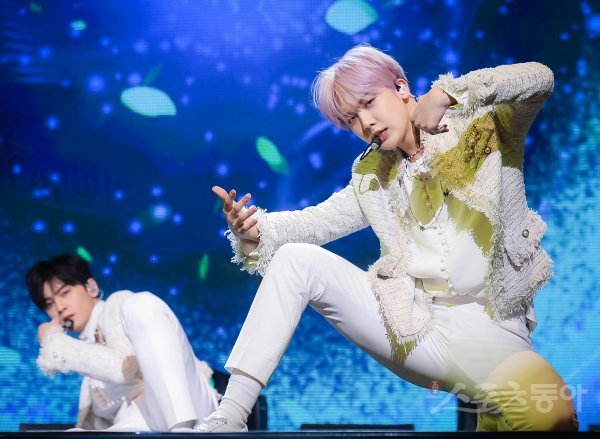 그룹 아스트로(ASTRO) 윤산하가 16일 서울 강남구 삼성동 코엑스 아티움에서 열린 첫 정규 앨범 ‘All Light(올라잇)’ 발매 쇼케이스에서 열정적인 무대를 펼치고 있다.