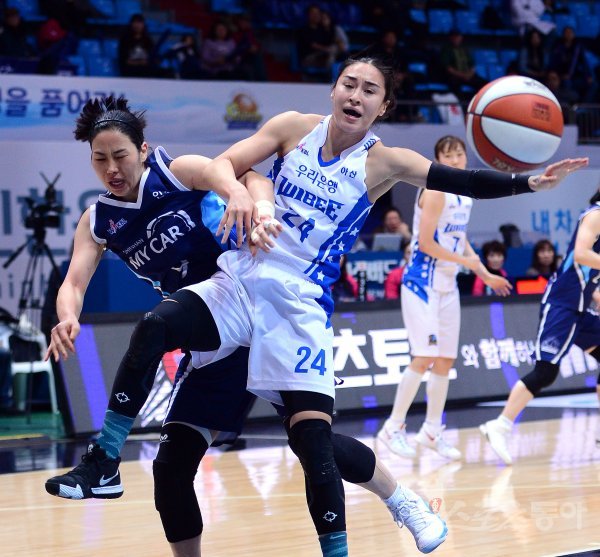 16일 인천 도원체육관에서 열린 ‘우리은행 2018-2019 여자 프로농구’ 아산 우리은행과 인천 신한은행 경기에서 우리은행 김소니아와 신한은행 곽주영이 리바운드 볼을 다투고 있다.