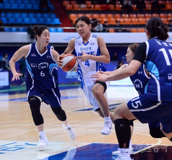 16일 인천 도원체육관에서 열린 ‘우리은행 2018-2019 여자 프로농구’ 아산 우리은행과 인천 신한은행 경기에서 우리은행 박지현이 신한은행의 수비를 뚫고 골밑을 공격하고 있다.