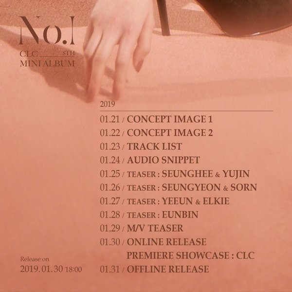 CLC는 17일 0시 CLC의 공식 SNS를 통해 오는 1월 30일 발매되는 여덟 번째 미니앨범 'No.1'의 스케줄 티저 이미지를 공개했다.