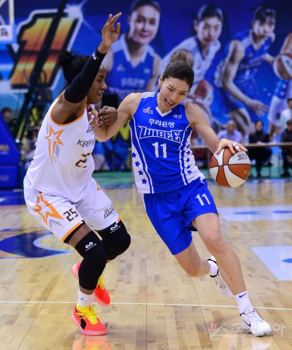 21일 아산 이순신체육관에서 열린 ‘우리은행 2018-2019 여자 프로농구’ 청주 KB스타즈와 아산 우리은행 경기에서 우리은행 임영희가 KB스타즈 쏜튼의 수비를 뚫고 골밑을 공격하고 있다.