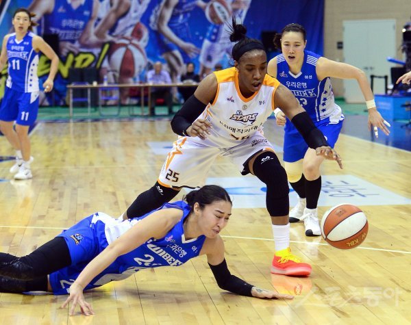 21일 아산 이순신체육관에서 열린 ‘우리은행 2018-2019 여자 프로농구’ 청주 KB스타즈와 아산 우리은행 경기에서 우리은행 김소니아와 KB스타즈이 루즈볼을 놓치고 있다.