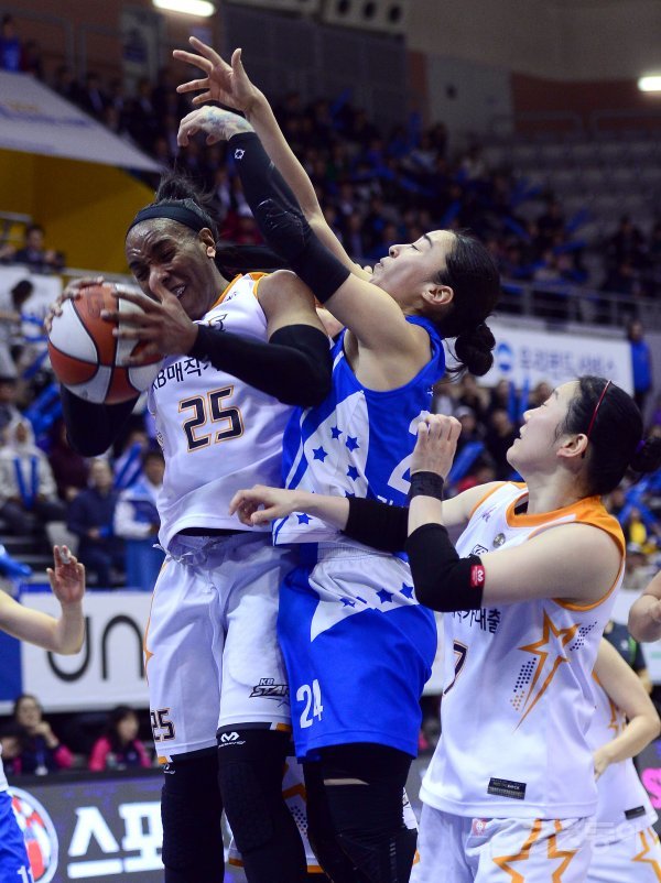 21일 아산 이순신체육관에서 열린 ‘우리은행 2018-2019 여자 프로농구’ 청주 KB스타즈와 아산 우리은행 경기에서 KB스타즈 쏜튼이 리바운드 볼을 잡고 있다.