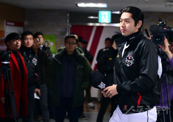 22일 수원 kt위즈파크에서 프로야구 ‘kt 위즈 2019 선수단 신년 결의식’이 열렸다. 신인선수 이대은이 인사를 위해 단상으로 향하고 있다.