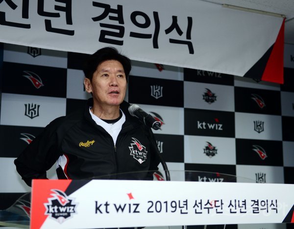 22일 수원 kt위즈파크에서 프로야구 ‘kt 위즈 2019 선수단 신년 결의식‘이 열렸다. 이강철 감독이 출사표를 밝히고 있다. 수원 | 김민성 기자 marineboy@donga.com