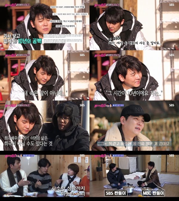 이어 최민용과 최성국은 영하 20도가 넘는 엄동설한에 야외 설거지를 하면서 허심탄회하게 그동안의 소회를 풀었다. 민용은 ‘하이킥’ 이후 오랜 공백에 대해 “잘하든 못하든 연기적으로 다른 모습을 보여드리고 싶었다. 근데 2년 넘게 계속 똑같은 장르와 캐릭터 섭외만 들어왔다. 그런 시간들이 점점 길어졌다”며 기사를 통해 그 시간이 10년이 지났다는 걸 뒤늦게 깨달았다고 고백했다.