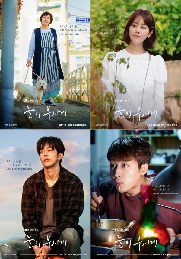 2월 11일 첫 방송되는 ‘눈이 부시게’가 23일, 각기 다른 ‘시간’의 의미를 담은 김혜자, 한지민, 남주혁, 손호준의 캐릭터 포스터를 공개해 호기심을 자극한다.