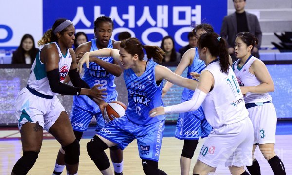 23일 용인실내체육관에서 열린 ‘우리은행 2018-2019 여자 프로농구’ KEB하나와 삼성생명 경기에서 KEB하나파커와 삼성생명 양인영이 루즈볼을 다투고 있다.