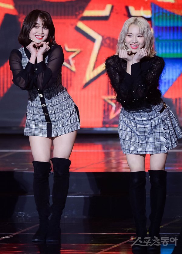 트와이스 지효와 채영(오른쪽)이 23일 서울 송파구 잠실실내체육관에서 열린 ‘제8회 가온차트 뮤직 어워즈’에서 열정적인 무대를 선보이고 있다.