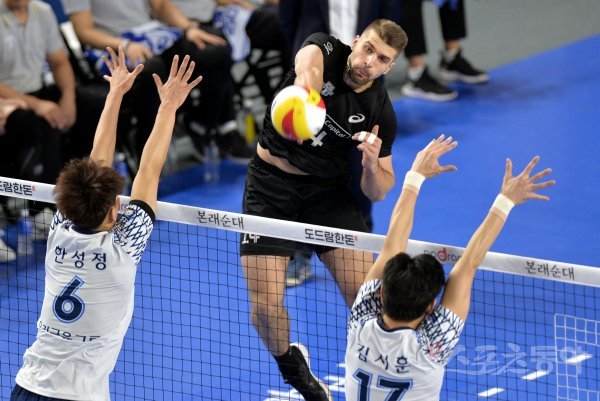 현대캐피탈 파다르가 우리카드 블로커를 피해 스파이크를 날리고 있다.