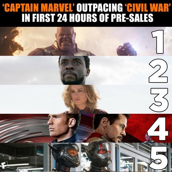 <캡틴 마블>의 압도적 오프닝 예측은 예매 화력으로 더욱 탄력을 받고 있다. 예매 사이트 판당고에 따르면 <캡틴 마블>은 사전 예매 오픈 24시간 만에 <캡틴 아메리카: 시빌 워>를 제치고 마블 최고 24시간 기록을 세운 2018년 전 세계 박스오피스 1위이자 역대 MCU 전 세계 박스오피스 1위 <어벤져스: 인피니티 워>, 북미 역대 MCU 및 2018년 박스오피스 1위를 차지한 <블랙 팬서>를 잇는 최고 예매량 기록을 세웠다.