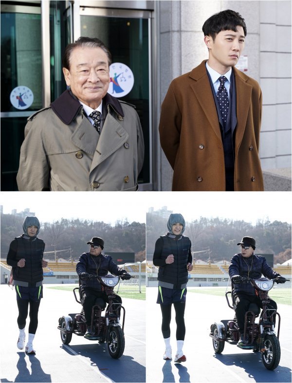 법원 앞 훈훈한 투샷을 보여주고 있는 두 사람은 누가 봐도 멋진 변호사와 든든한 사무장의 모습이다. 하지만, 곧이어 눈을 의심하게 하는 스틸이 시선을 사로잡는다. 타이트한 검은 타이즈에 흰 양말, 꽉 조인 후드를 덮어 쓴 고태림. 단정한 수트의 럭셔리한 스타일링을 고집하는 변호사 고태림이 맞나, 한 번 더 보게 될 정도로 난해한 조깅 패션이다. 거기에 앙다문 입과 불만에 가득 찬 표정의 고태림 곁에서 코칭을 하고 있는 듯한 구세중의 단호함이 더해지니, 웃음은 배가 된다. 법원 앞에선 인자한 미소를 짓던 구세중은 국가대표 코치에 버금가는 올블랙 카리스마를 뿜어내, 이 인물의 진짜 정체는 무엇인지 궁금해지기까지 한다.