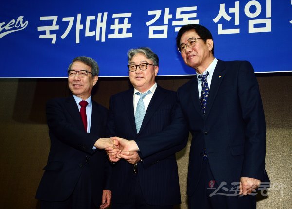 28일 서울 도곡동 한국야구회관에서 야구 국가대표 감독 선임 기자회견이 열렸다. 국가대표 감독에 선임된 김경문 감독이 정운찬 KBO총재, 김시진 위원장과 기념촬영을 하고 있다.