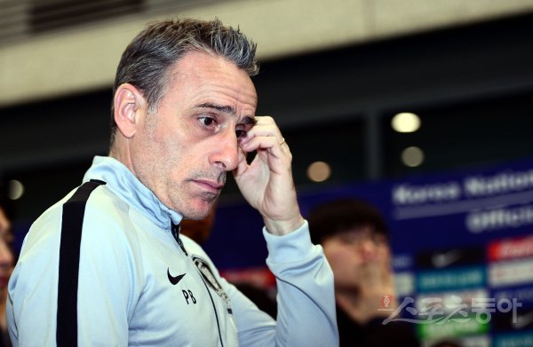 축구대표팀 벤투 감독이 인터뷰를 앞두고 생각에 잠겨 있다.