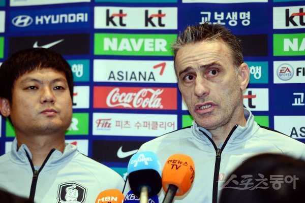 축구대표팀 벤투 감독이 인터뷰를 하고 있다.
