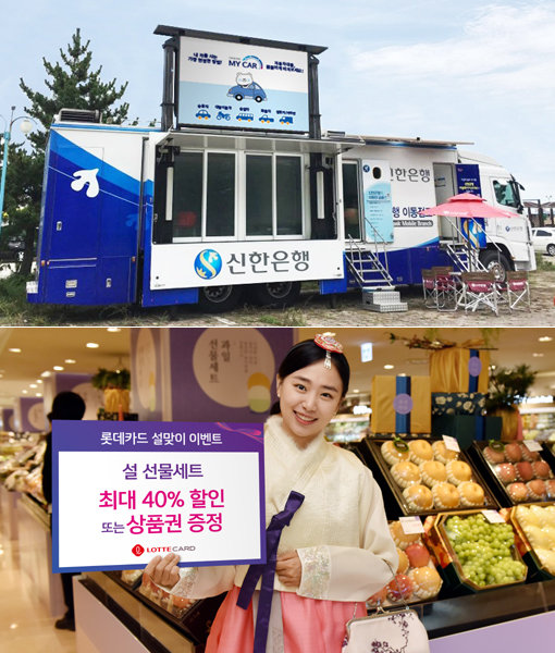 신한은행 이동점포 뱅버드(위쪽)와 롯데카드 설 명절 이벤트. 설 명절을 맞은 금융권의 움직임이 분주하다. 사진제공|신한은행·롯데카드