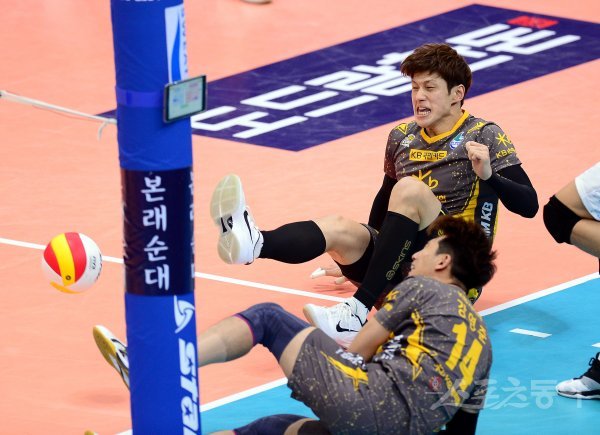 28일 수원실내체육관에서 열린 ‘2017-18 도드람 V리그’ 남자부 KB손해보험과 한국전력 경기에서 KB손해보험 김홍정이 발로 리시브를 시도했으나 실패하고 있다.