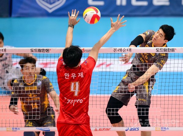 28일 수원실내체육관에서 열린 ‘2017-18 도드람 V리그’ 남자부 KB손해보험과 한국전력 경기에서 KB손해보험 이수황이 한국전력의 블로킹 사이로 스파이크를 날리고 있다.