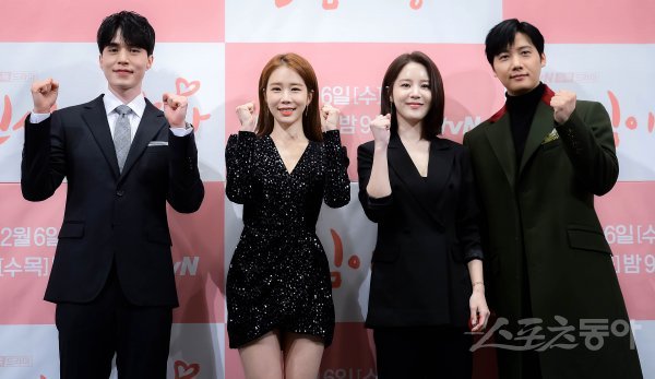 배우 이동욱과 유인나, 손성윤, 이상우(왼쪽부터)가 29일 서울시 강남구 임피리얼 팰리스 서울에서 열린 tvN 새 수목드라마 ‘진심이 닿다’ 제작발표회에 참석해 포토타임을 갖고 있다.