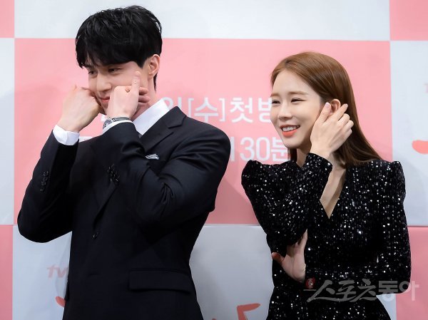 배우 이동욱과 유인나(오른쪽)가 29일 서울시 강남구 임피리얼 팰리스 서울에서 열린 tvN 새 수목드라마 ‘진심이 닿다’ 제작발표회에 참석해 포토타임을 갖고 있다.