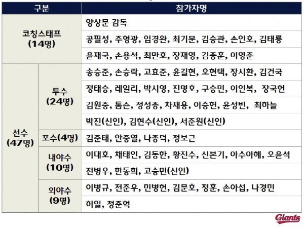 전지훈련에는 양상문 감독 등 코칭스태프 14명과 선수 47명이 참가하며 30일 김해공항(오전 10시 40분, BX795)을 통해 대만 카오슝으로 출국한다.