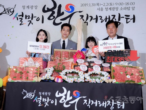 배우 남궁민(가운데)이 30일 서울 중구 한국프레스센터에서 열린 ‘2019 한우 홍보대사 위촉식 및 설맞이 한우 직거래장터 포토행사’에 참석해 포즈를 취하고 있다.
