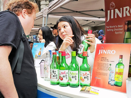 지난달 10월 뉴욕 맨해튼에서 열린 한인축제에서 자두에이슬 등 하이트진로의 제품들을 소개하고 있다. 사진제공ㅣ 하이트진로