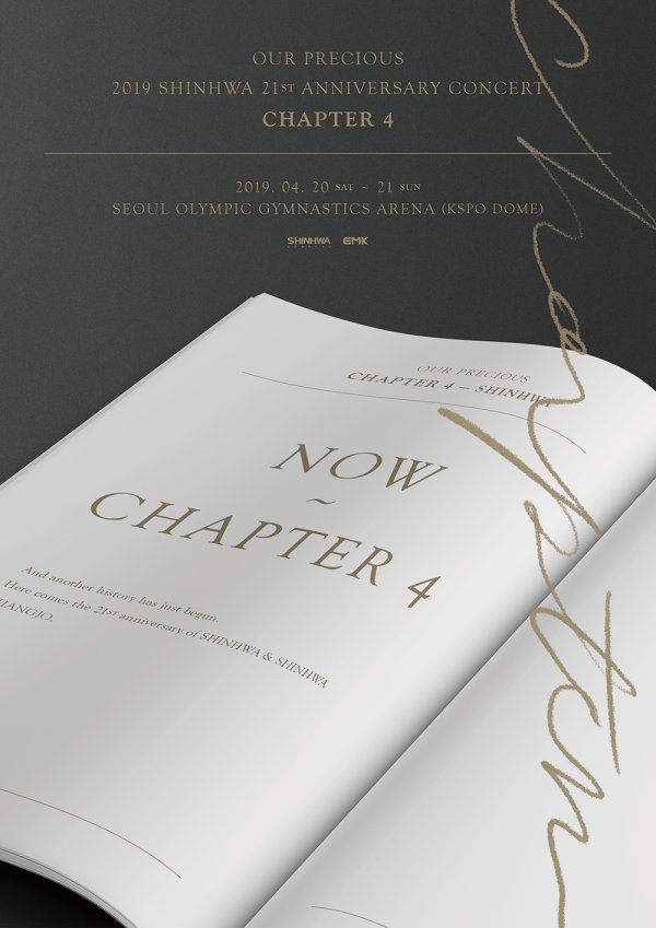 또 오늘(31일) 공개된 ‘CHAPTER 4’ 포스터에는 ‘OUR PRECIOUS 2019 SHINHWA 21ST ANNIVERSARY CONCERT CHAPTER 4’ 문구와 함께 콘서트 날짜와 장소가 적혀 있어 데뷔 21주년을 기념하는 콘서트에 대한 정보로 팬들의 기대감을 높이고 있으며 포스터 중간에 쓰인 ‘NOW ~ CHAPTER 4’라는 카피는 신화가 보여줄 새로운 챕터에 대한 관심을 높이고 있다.