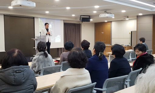 자생한방병원 이진호 병원장이 강남자생봉사단원들을 대상으로 무릎관절 건강강좌를 진행하고 있다.