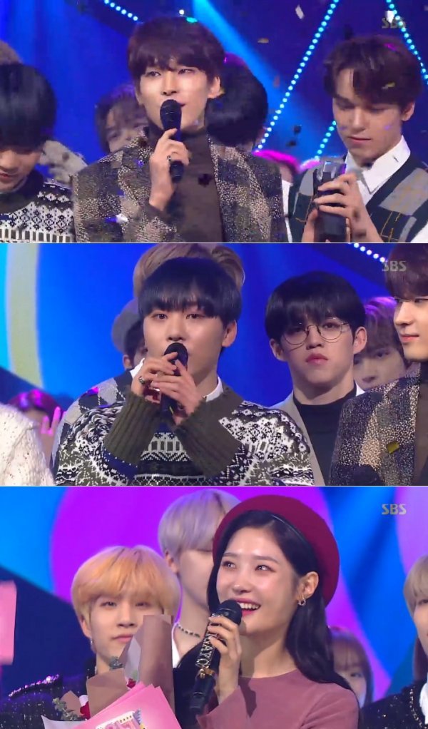 접전 끝에 1위는 세븐틴이 차지했다. 데뷔 이후 ‘인기가요’에서 첫 1위 트로피를 안게 된 것. 세븐틴은 “캐럿(팬덤)에게 진심으로 감사드린다. 앞으로도 캐럿을 위로하는 아이돌이 되겠다. 캐럿의 아이돌이라서 자랑스럽다”며 “‘인기가요’에서 1위 후보에는 오른 적 잇는데 1위를 한 건 처음이다. ‘인기가요’에서 첫 1위를 기록하고 특히 이번 앨범으로 1위를 할 수 있게 돼 더욱 감사하다”고 소감을 밝혔다.