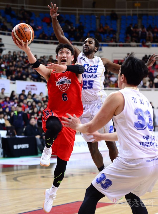 6일 울산 동천체육관에서 열린 ‘2018-2019 SKT 5GX 프로농구’ 울산 모비스와 전주 KCC의 경기에서 모비스 양동근이 KCC 티그의 수비를 피해 슛을 쏘고 있다.
