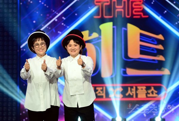 7일 서울 여의도 KBS 별관에서 열린 KBS 2TV 새 예능 ‘뮤직셔플쇼 더히트(THE HIT)’ 기자간담회에 참석한 MC 송은이와 김신영이 카메라를 향해 포즈를 취하고 있다.