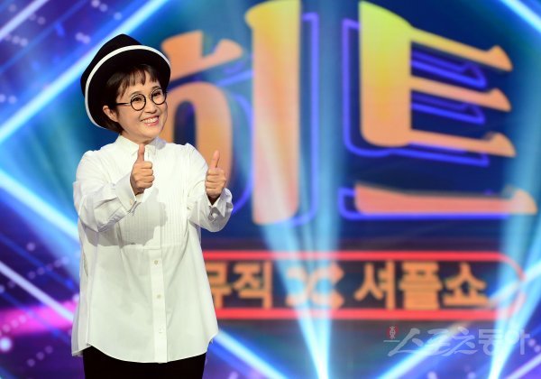 7일 서울 여의도 KBS 별관에서 열린 KBS 2TV 새 예능 ‘뮤직셔플쇼 더히트(THE HIT)’ 기자간담회에 참석한 MC 송은이가 카메라를 향해 포즈를 취하고 있다.