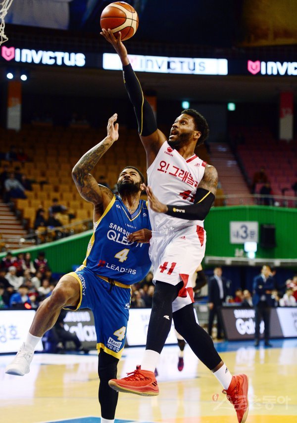 7일 서울 잠실체육관에서 열린 ‘2018-2019 SKT 5GX 프로농구’ 서울 삼성과 고양 오리온의 경기에서 오리온 먼로가 삼성 펠프스의 수비를 피해 슛을 쏘고 있다.