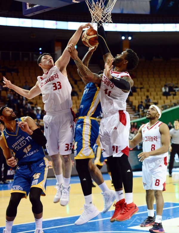 7일 서울 잠실체육관에서 열린 ‘2018-2019 SKT 5GX 프로농구’ 서울 삼성과 고양 오리온의 경기에서 삼성 펠프스의 슛을 오리온 이승현과 먼로가 수비하고 있다.