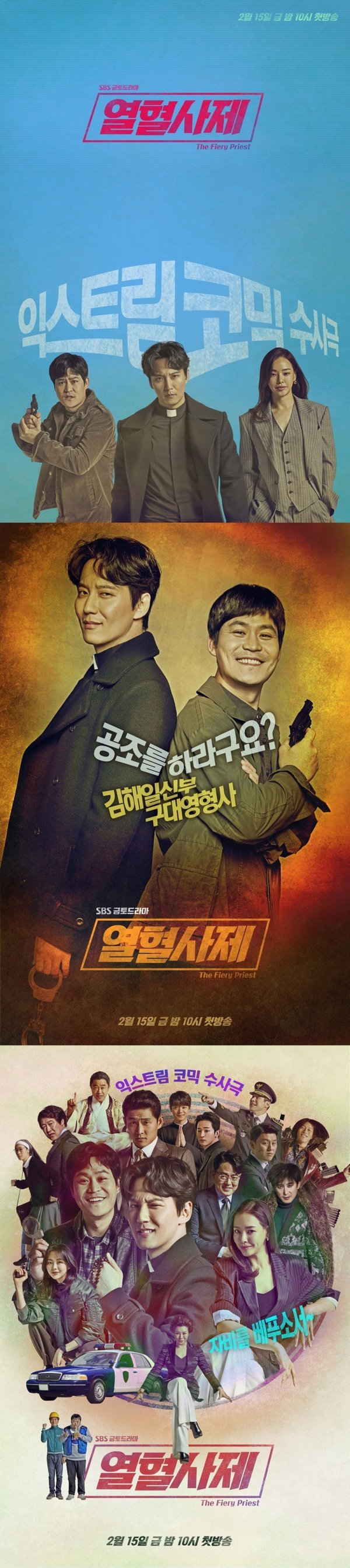 이런 가운데 2월 9일 ‘열혈사제’ 제작진이 ‘익스트림 코믹 수사극’이라는 드라마의 색깔을 오롯이 담은 공식 포스터 3종을 공개했다. 금요일-토요일 밤, 안방극장을 묵직한 웃음, 짜릿한 카타르시스로 물들일 ‘열혈사제’에 대한 기대감을 한층 고조시킨다.