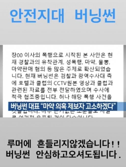 버닝썬 이 대표는 8일 자신의 SNS에 ‘버닝썬’ 마약 투약 의혹을 제보한 이들을 고소하겠다고 한 뉴스 화면을 캡처해 올리며 “안전지대 버닝썬”이라고 강조했다. 그러면서 “루머에 흔들리지 않겠습니다”라며 “버닝썬 안심하고 오셔도 됩니다”라고 홍보했다.