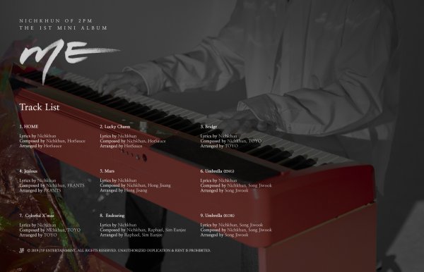 닉쿤은 18일 오후 6시 국내서 첫 솔로 미니 앨범 \'ME\'를 발표한다. 이와 관련해 JYP엔터테인먼트는 11일 0시 JYP 및 2PM의 각종 SNS 채널을 통해 앨범 \'ME\'의 트랙리스트를 선보였다.