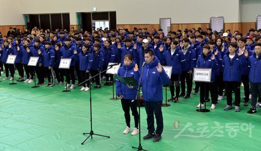 11일 충북 진천 선수촌에서 ‘2019 국가대표 선수촌 훈련개시식’이 열렸다. 훈련개시식에 참석한 자전거 나아름, 양궁 이우석이 선수단을 대표해 선서를 하고 있다. 진천|김민성 기자 marineboy@donga.com