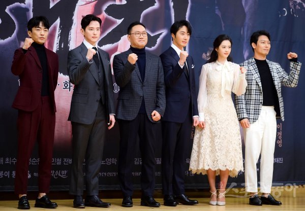 11일 서울 양천구 목동 SBS사옥에서 열린 SBS 새 월화드라마 ‘해치’ 제작보고회에서 감독과 출연 배우들이 포즈를 취하고 있다. 왼쪽부터 배우 정문성, 권율, 이용석PD, 배우 정일우, 고아라, 박훈.