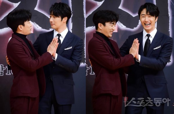 배우 정문성과 정일우(오른쪽)가 11일 서울 양천구 목동 SBS사옥에서 열린 SBS 새 월화드라마 ‘해치’ 제작보고회에서 포즈를 취하고 있다.