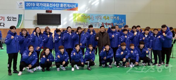 11일 충북 진천 선수촌에서 ‘2019 국가대표 선수촌 훈련개시식’이 열렸다. 훈련개시식에 참석한 역도 국가대표 선수 및 코치들이 기념촬영을 하고 있다.