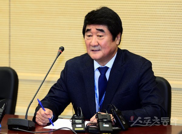 11일 충북 진천 선수촌에서 ‘2019 국가대표 선수촌 훈련개시식’이 열렸다. 신치용 신임 선수촌장이 기자들과 인터뷰를 하고 있다.