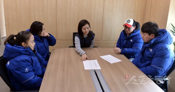 11일 충북 진천 선수촌에서 ‘2019 국가대표 선수촌 훈련개시식’이 열렸다. 훈련개시식에 앞서 선수인권상담실 개소식에 참석한 안상아 인권상담사가 선수들과 이야기를 나누고 있다.