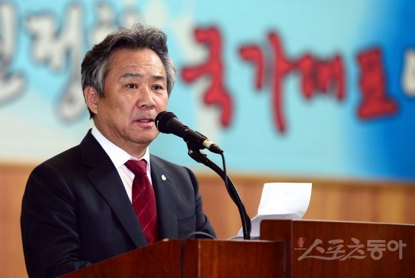 11일 충북 진천 선수촌에서 ‘2019 국가대표 선수촌 훈련개시식’이 열렸다. 훈련개시식에 참석한 이기흥 대한체육회장이 개회사를 밝히고 있다.