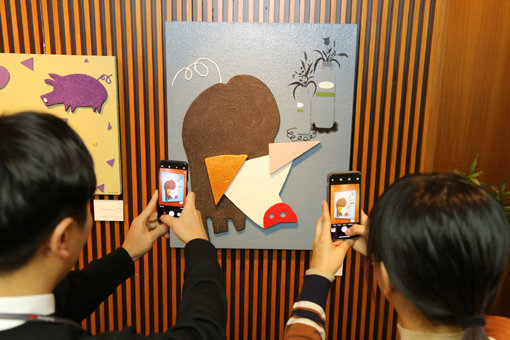 광동제약 직원들이 ‘2019 복 받으세요! 황금돼지 전(展)’ 작품을 감상하며 사진을 찍고 있다. 사진제공|광동제약