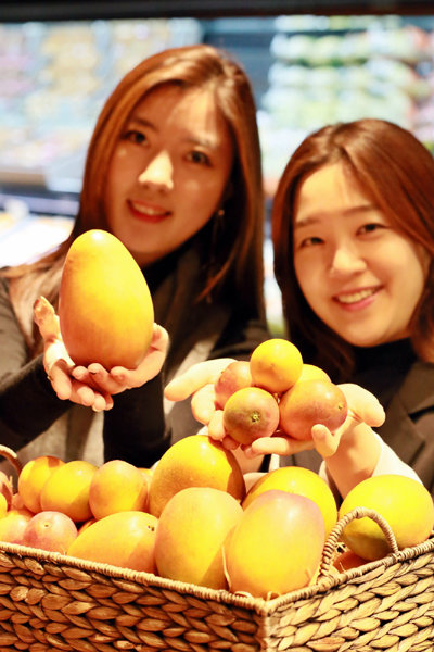 갤러리아백화점이 올해 첫 출시한 제주산 애플망고를 내놓았다. 애플망고는 잘 익으면 사과처럼 색이 붉게 변하며 달고 향이 좋아 ‘과일의 여왕’이라 불린다. 사진은 13일 서울 압구정 갤러리아명품관 고메이494에서 모델들이 애플망고를 선보이고 있는 모습.