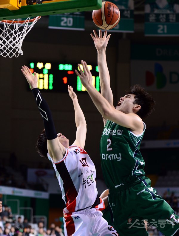 13일 강원도 원주종합체육관에서 열린 ‘2018-2019 SKT 5GX 프로농구’ 원주 DB와 부산 kt의 경기에서 DB 정희원이 kt 최성모의 수비를 피해 슛을 쏘고 있다.
