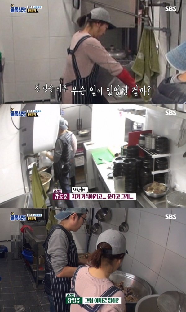 ‘골목식당’ 회기동 편 첫 방송이 나간 다음날 고깃집 사장 아내 장영주 씨는 재료를 준비하며 심란해 했다. 아내의 심란한 모습에 남편 강도훈 씨는 “우리 절대로 더 이상 울면 안 된다. 사람들이) 가식이라고 운다 한다”고 아내를 위로했다. 알고 보니 장영주 씨는 첫 방송 후 달린 악플에 상처를 받은 것.